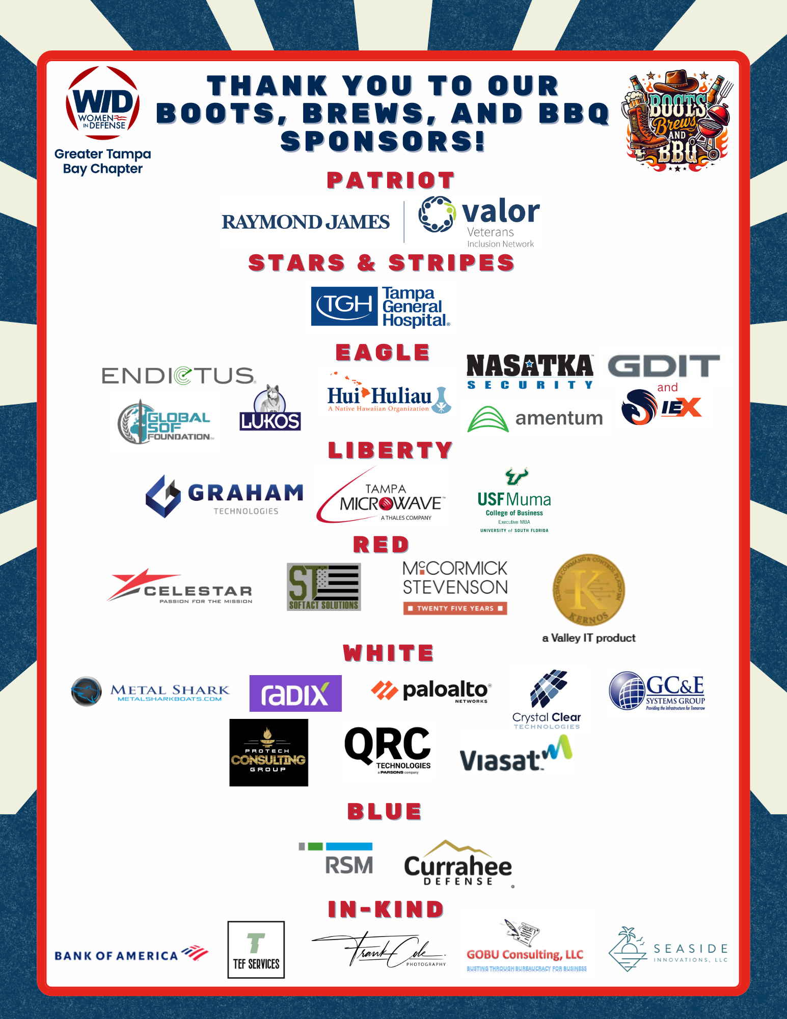 Boots, Brews, and BBQ was an annual fundraising event hosted by the Women in Defense (WID) Greater Tampa Bay Chapter, bringing together members of the defense community, industry professionals, and supporters to celebrate camaraderie while contributing to an impactful cause: supporting young women in their pursuit of degrees in STEM (Science, Technology, Engineering, and Mathematics) fields.