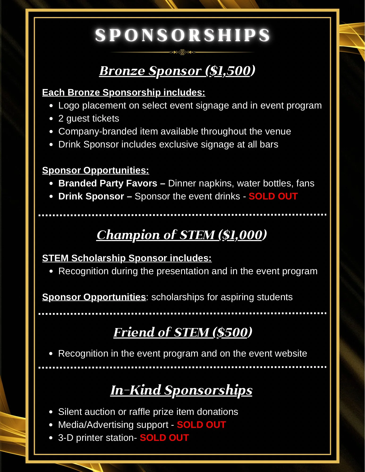 Interested in becoming a 2025 Salute to STEM sponsor? We'd love to have you join us in making a difference! Please reach out to either Kati Hippleheuser at khippleheauser@seasideinnovations.com, Victoria Jolly at jollyv@usf.edu or Janiece Marquez at janiece@glasshalo.co for sponsorship opportunities.